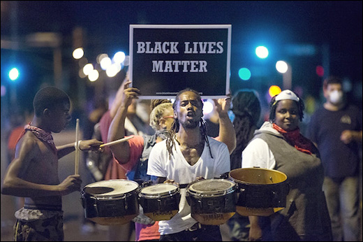 Demonstrators, marking the one-year anniversary of the shooting of Michael Brown, protest along West Florrisant Street on August 10, 2015 in Ferguson, Missouri. Use: Michael Brown anniversary