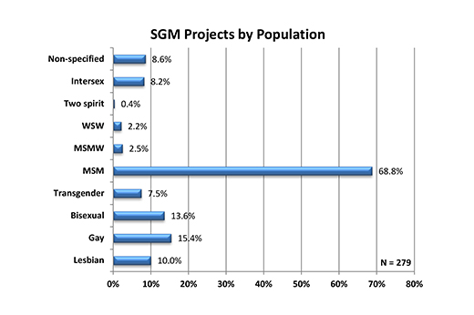 Sexual and gender minority projects by population. Men who have sex with men (MSM) are the most commonly represented population